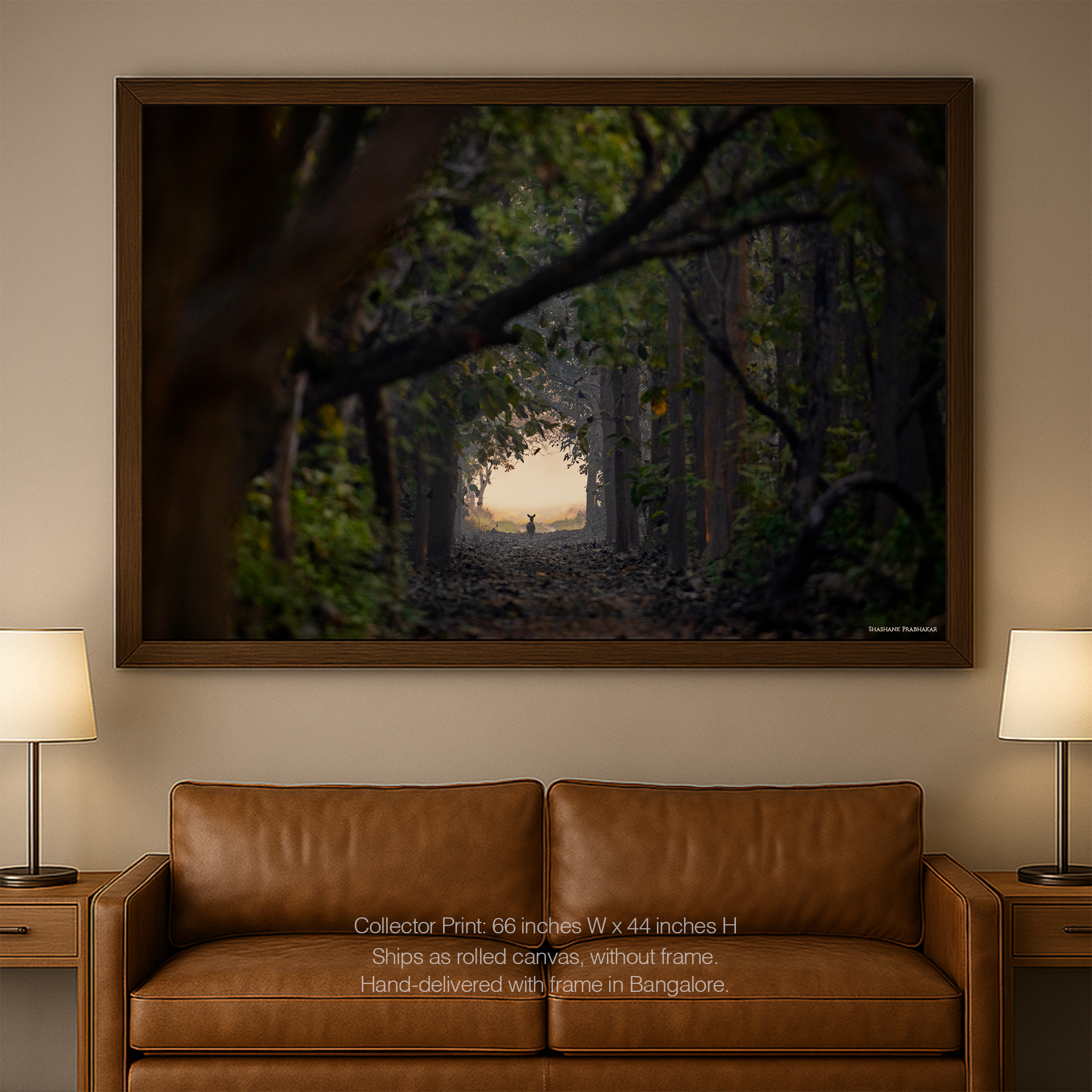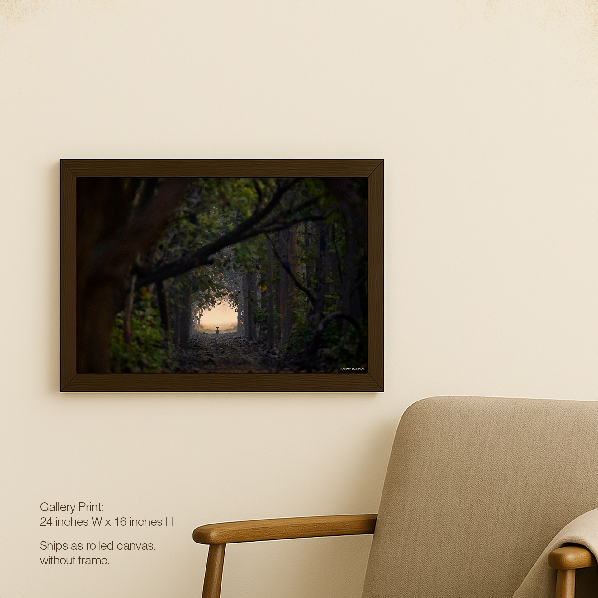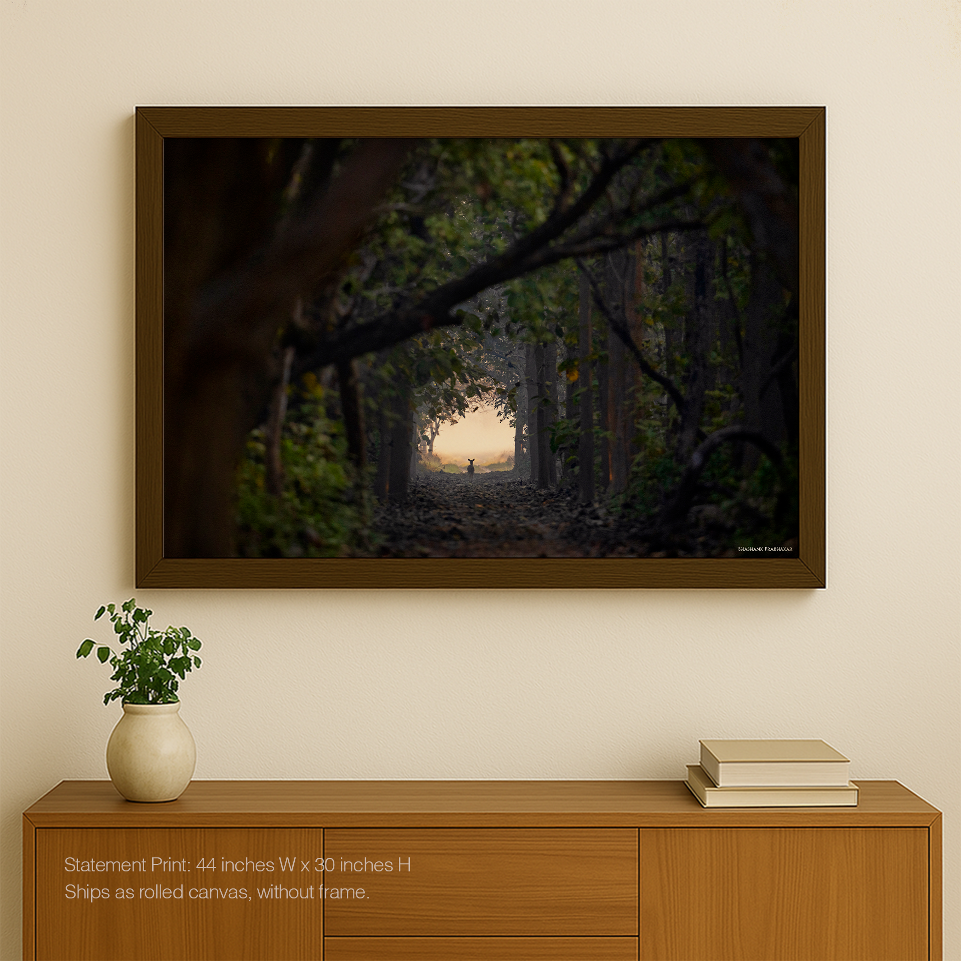 This serene moment highlights the unique blend of habitats in Dudhwa National Park, where forest and grassland meet in a delicate balance. Available in multiple print sizes, "Light’s Passage" brings the magic of this rare landscape and its gentle inhabitants into your home.