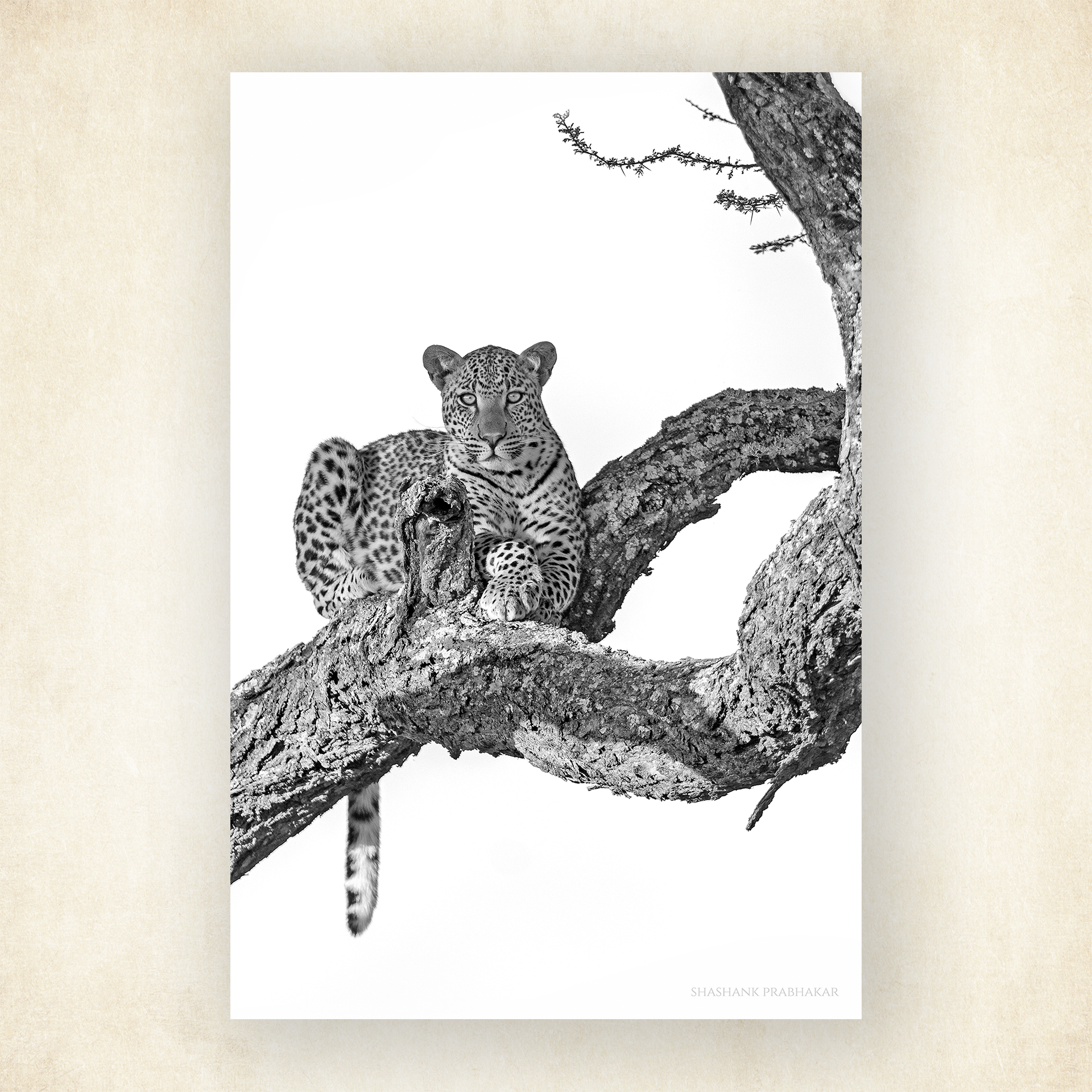 In striking monochrome against a pure white backdrop, this portrait captures a leopard seated with quiet dignity, locking eyes directly with the camera. From Ndutu’s timeless wilds, the leopard’s gaze commands attention - royal, poised, and undeniably fierce.