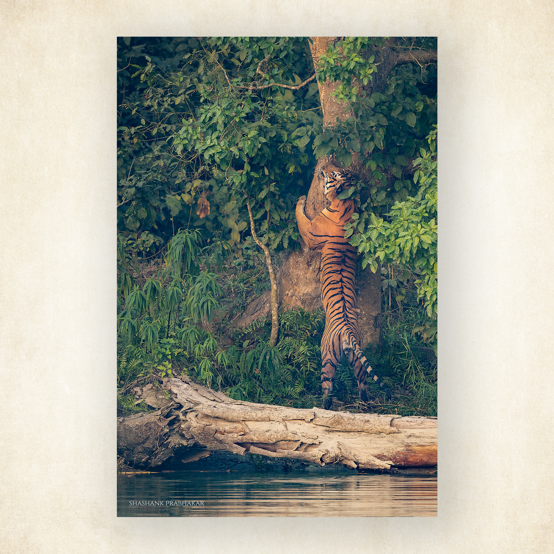 A colossal male tiger, proud and unmistakably dominant, presses his massive frame against a tree - a silent yet fierce declaration of territory. Captured beside the tranquil canal waters of Pilibhit Tiger Reserve, this intimate moment reveals the raw power and grace of a wild monarch at rest.