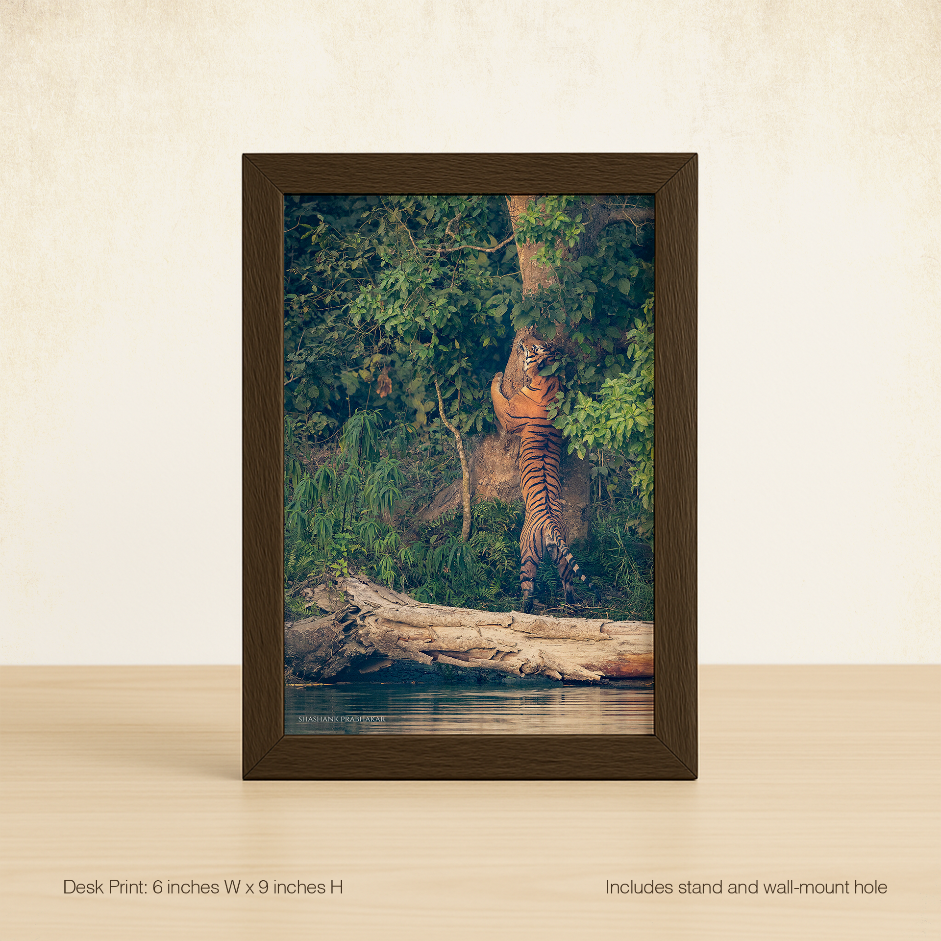 The Desk Print (9 inches x 6 inches) comes with a wooden-look frame, and a stand. It can also be wall-mounted.