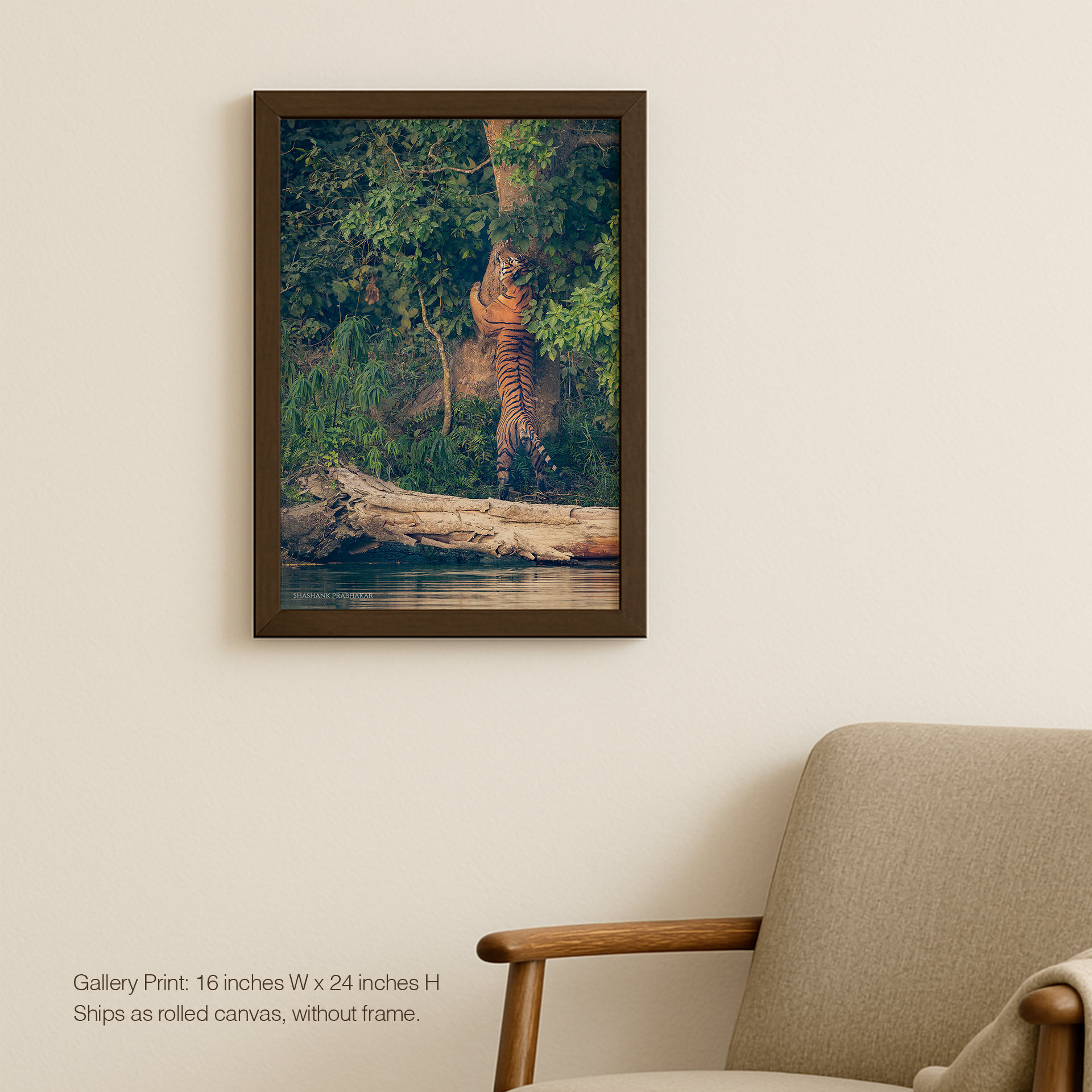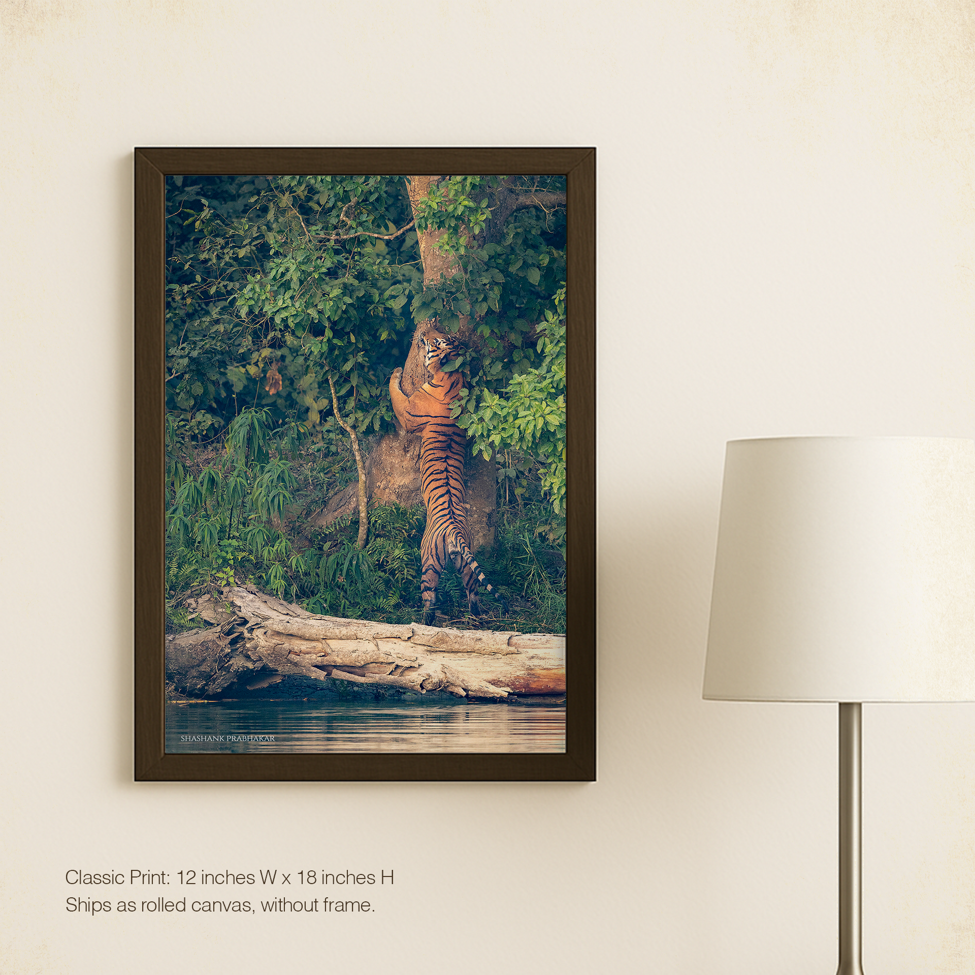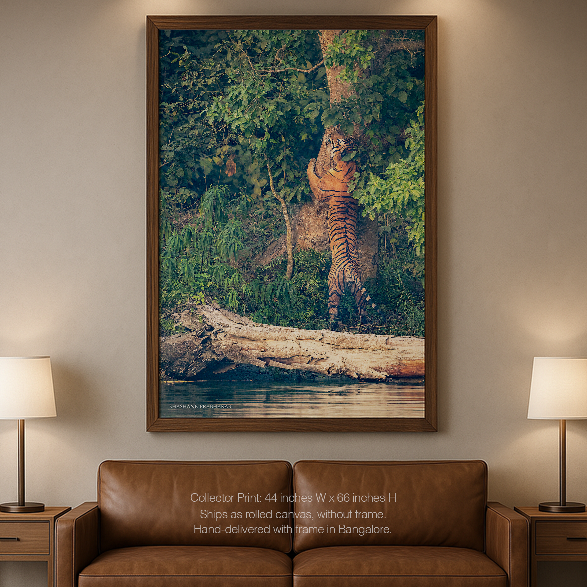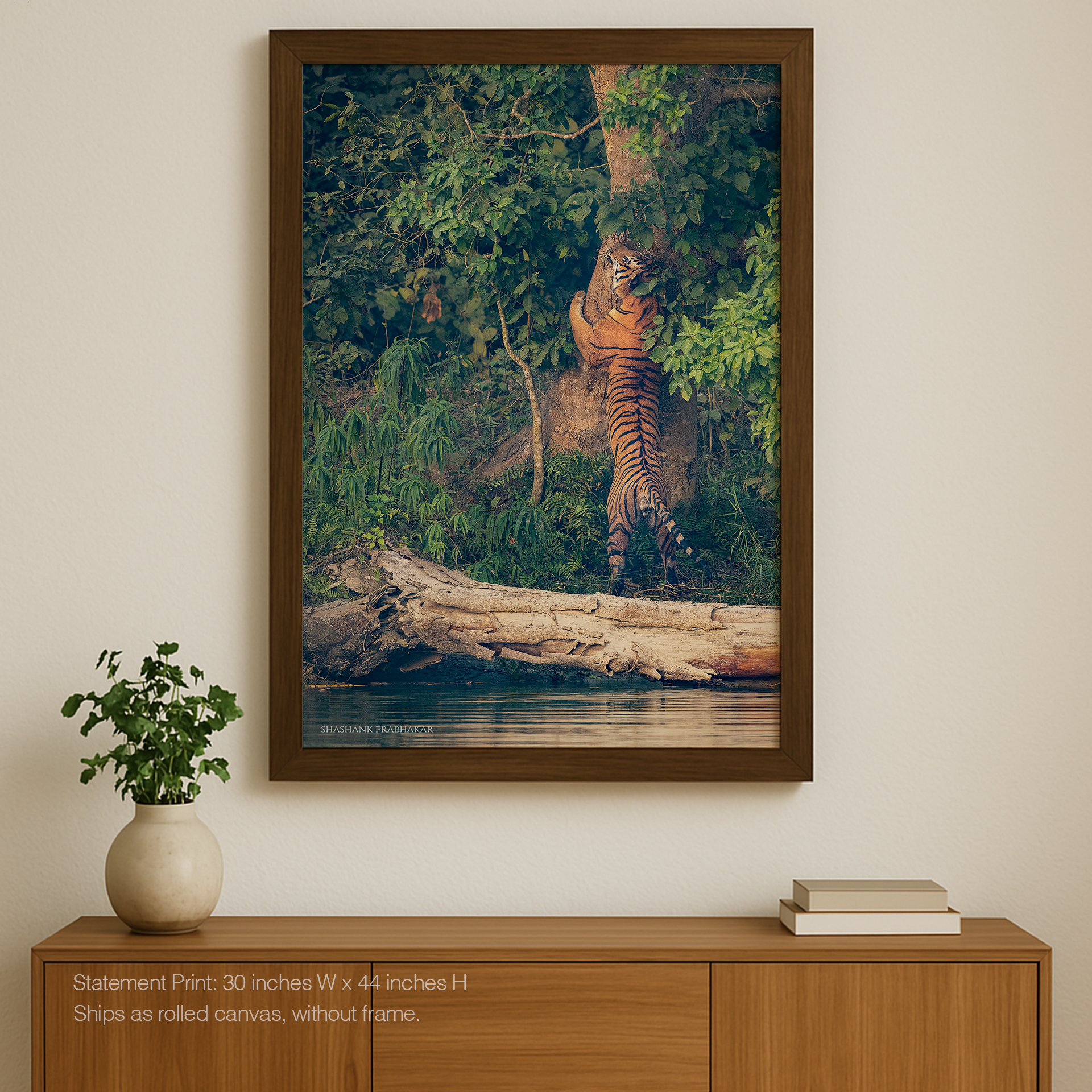 The tiger’s hug tells stories of strength and possession, his presence vast and majestic against the natural backdrop. Whether displayed in an intimate setting or a grand space, this print holds the fierce spirit and commanding size of the jungle king.